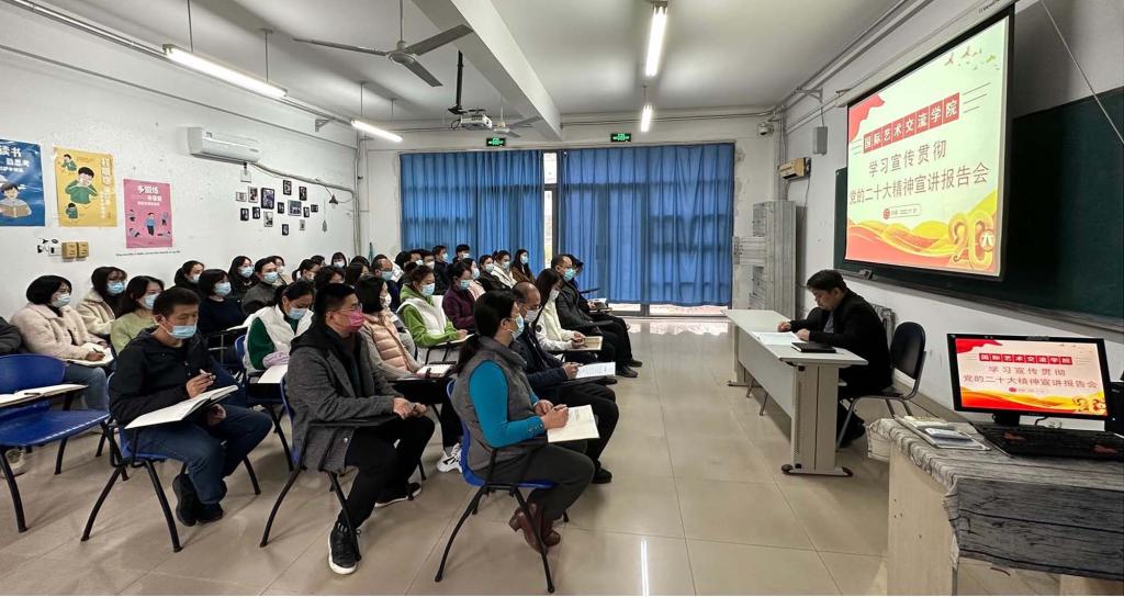 11月21日,国际艺术交流学院党总支开展学习宣传贯彻党的二十大精神宣讲工作。宣讲在国交楼101教室开展,国际艺术交流学院党总支书记张博作为宣讲人对国交学院全体教职工进行宣讲。