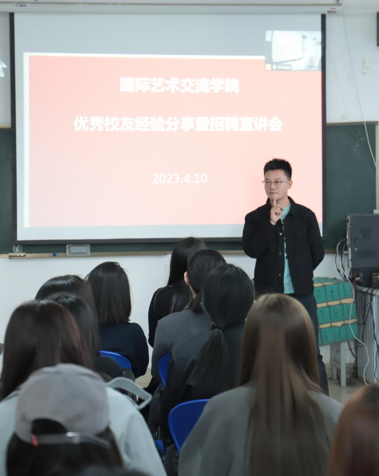 4月10日,国际艺术交流学院邀请宋洋、师壮、刘晓明、吕旭辉、薛童、毕慧蕊、宋阳等7位优秀校友代表参加优秀校友经验分享暨招聘宣讲会,会议由党总支副书记梁静主持。