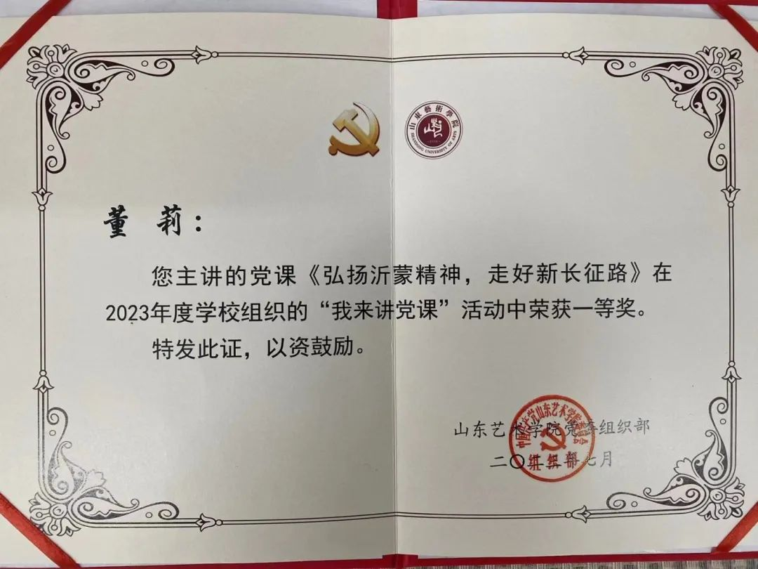 经校评审,党总支书记董莉主讲的党课《弘扬沂蒙精神,走好新长征路》,在2023年度学校组织的“我来讲党课”活动中荣获一等奖;党总支副书记梁静主讲的党课《英雄的可可托海》和团总支书记主讲的党课《艺心铸魂绘新程,踔厉奋发向未来》,在本次活动中荣获二等奖。