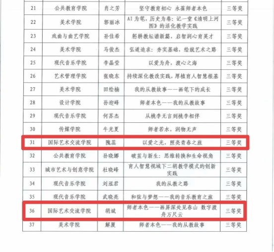 为深入学习贯彻教育家精神,激发广大教师的思想认同与情感共鸣,引导教职工立足岗位、涵育教育智慧,山东艺术学院于2025年4月成功举办“师者本色——我的从教故事”主题征文活动。活动旨在弘扬师德风范,厚植家国情怀,彰显新时代教育工作者的责任感和教育情感,激励教师致力于培育德才兼备、具备艺术特质和创新精神的优秀人才。经评审,我院隗蕊老师的《以爱之光,照亮青春之旅》与胡斌老师的《师者本色——画屏深处见春山 数字渡舟万尺云》荣获三等奖