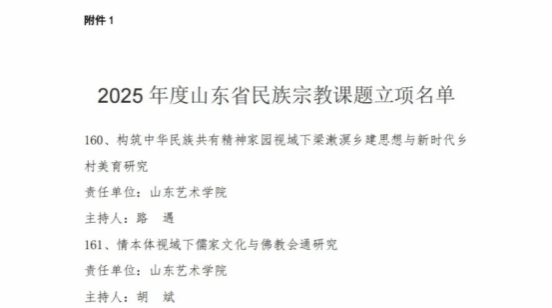 近日,山东省民族宗教事务委员会发布《关于公布2025年山东省民族宗教课题立项的通知》,国际艺术交流学院胡斌博士主持申报的《情本体视域下儒家文化与佛教会通研究》获批立项。