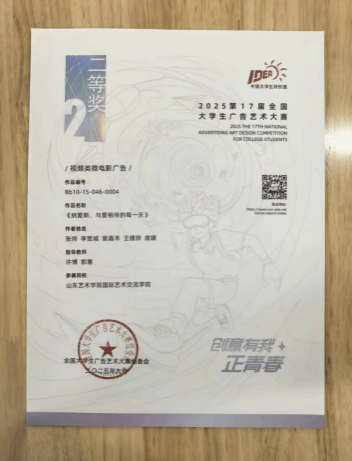 全国广告艺术大赛是国内具有广泛影响力的一项广告类专业赛事。该赛事以其专业性、权威性和创新性著称,吸引了全国百余所高校的数万件作品同台竞技。在创作过程中,参赛成员紧扣赛事主题,融合专业知识与创新思维,从创意构思、内容打磨到作品呈现,每一个环节都精益求精。在许博、郭意两位老师的悉心指导下,小组成员紧密协作,反复推敲创意细节,不断优化作品表现,最终凭借独特的创意视角、扎实的专业素养与精湛的制作水平,在众多参赛作品中脱颖而出。