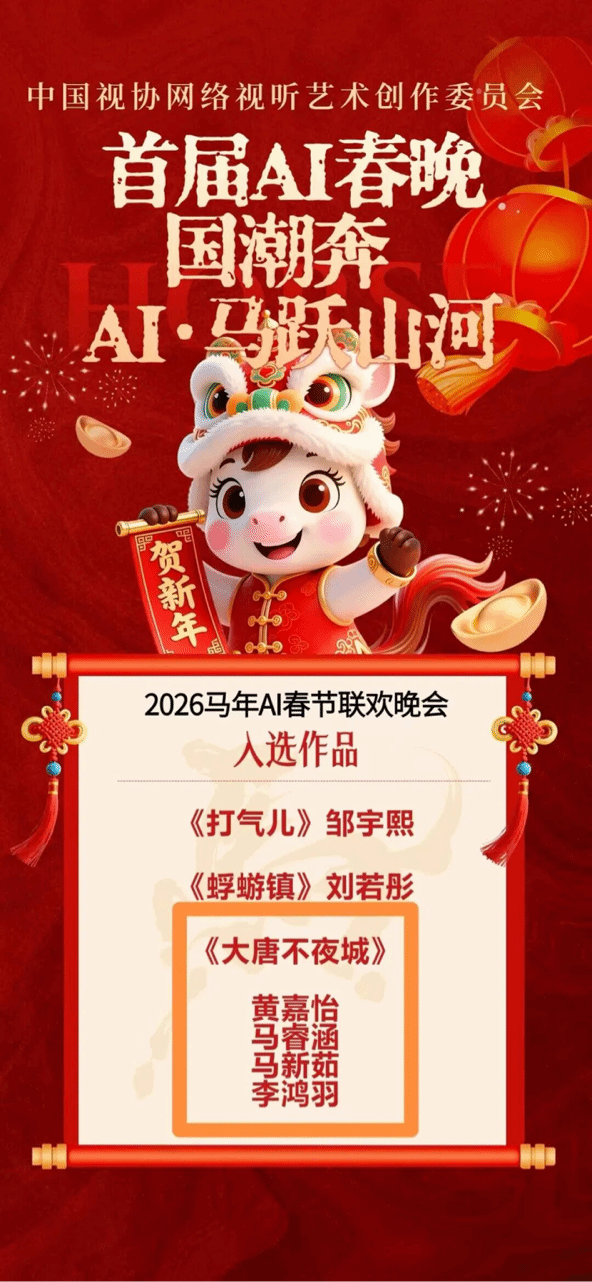 2月19日,大年初三,我校学生作品成功入选中国视协网络视听艺术创作委员会首届AI春晚“国潮奔AI·马跃山河”——2026丙午马年AI春晚,在江苏卫视首播,并陆续在山西卫视、重庆卫视、抖音、咪咕等多个平台同步播出。