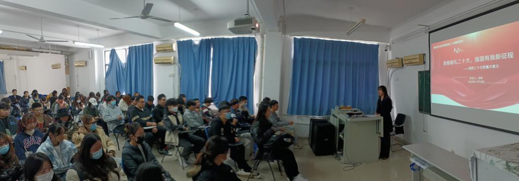 宣讲会上,党总支副书记梁静紧紧围绕教育部办公厅印发的《“青春献礼二十大,强国有我新征程”迎接学习宣传党的二十大主题宣传教育活动工作方案》的要求,以“青春献礼二十大,强国有我新征程”为题目,深入宣传习近平总书记带领全党全国各族人民在实现中华民族伟大复兴新征程上走过的非凡十年,广泛宣传党和人民创造的新作为新业绩,深入浅出地向同学们讲解党的二十大的重大意义,切实把高校师生的思想统一到党的二十大精神上来,弘扬“奋进新征程,建功新时代”主旋律,切实激发广大师生向第二个百年奋斗目标奋勇前进。