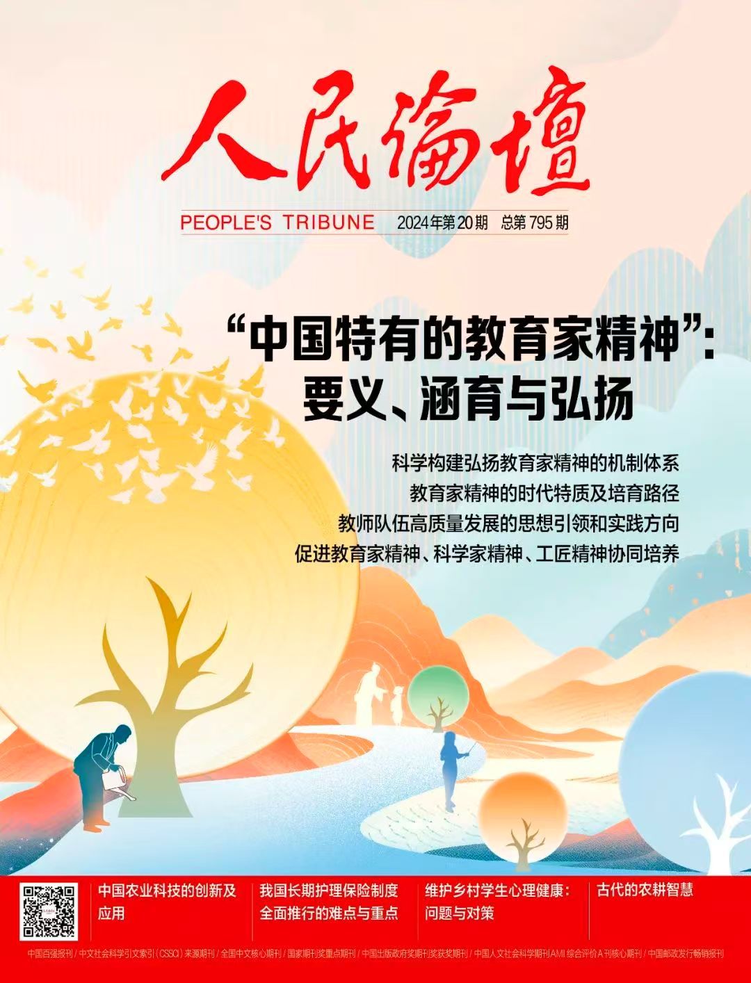 中国特有的教育家精神,即“心有大我、至诚报国的理想信念,言为士则、行为世范的道德情操,启智润心、因材施教的育人智慧,勤学笃行、求是创新的躬耕态度,乐教爱生、甘于奉献的仁爱之心,胸怀天下、以文化人的弘道追求”。如何深刻理解“中国特有的教育家精神”的内涵要义?如何弘扬教育家精神,培养造就高质量教师队伍?一起来看本期《人民论坛》特别策划!
